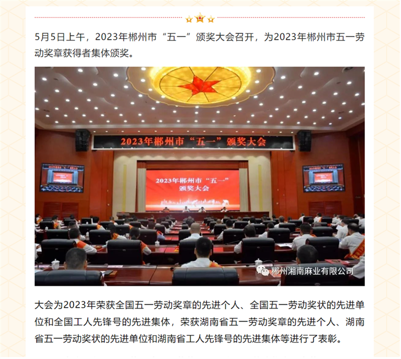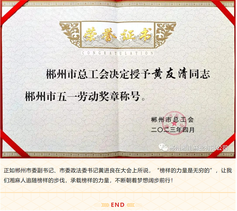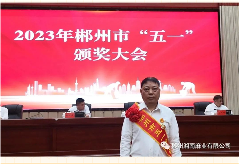 喜報丨郴州湘南麻業(yè)黃友清同志榮獲“郴州市五一勞動獎?wù)隆惫鈽s稱號
